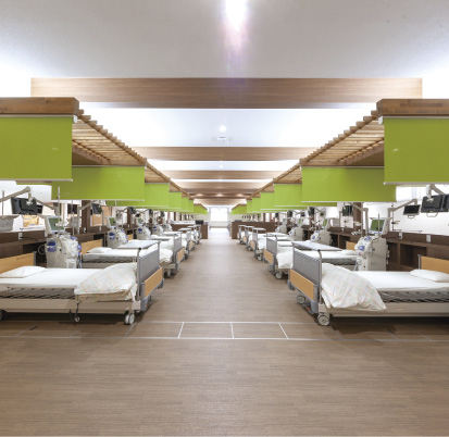 大きな特徴は、透析後の倦怠感やかゆみの軽減に効果があると報告されている「電解水透析」を、道北地域で初めて導入していること。心臓や脳の血管病発症のリスクが通常透析に比べて41%抑制されたと発表がある。さらに、足浴専用スペースを設けフットケアも充実。フレイル(加齢により心身が衰えた状態)の予防として、透析中の腎臓リハビリテーションも実施。長時間透析(週3回6時間透析)にも積極的に対応し、体への負担を可能な限り減らすことで生命予後の改善にも努めている。